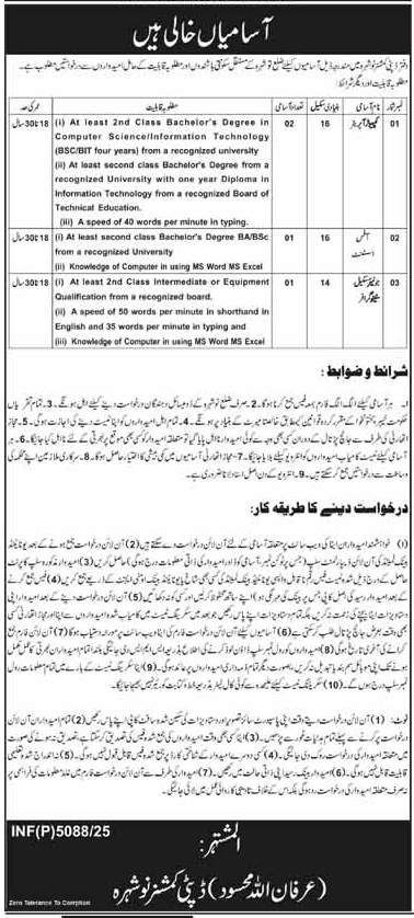 Vacant posts including stenographer, computer operator and office assistant are announced in Deputy Commissioner Office Nowshera, nowshera Khyber Pakhtunkhwa KPK Pakistan as per 5 December 2025 advertisement in daily Mashriq Newspaper. Persons with Matric, Middle, Intermediate and Bachelor etc. education can apply.