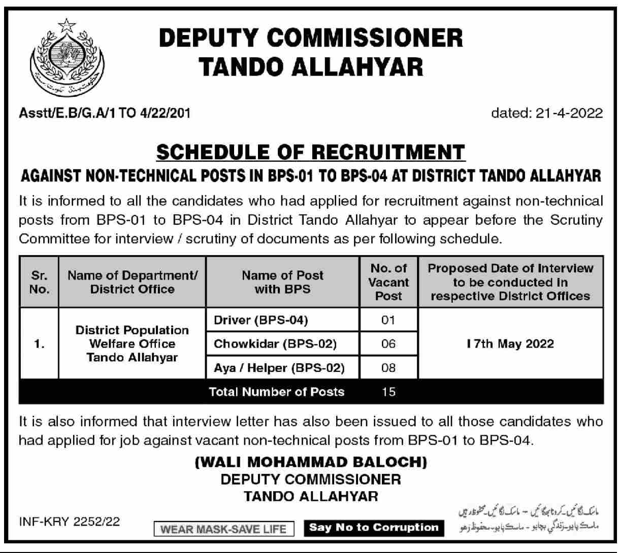 Deputy Commissioner District Office invites applications for job positions advertised in daily Dawn dated 30 April 2022 for following vacancies in Tando Allahyar, tando allahyar Sindh Pakistan.