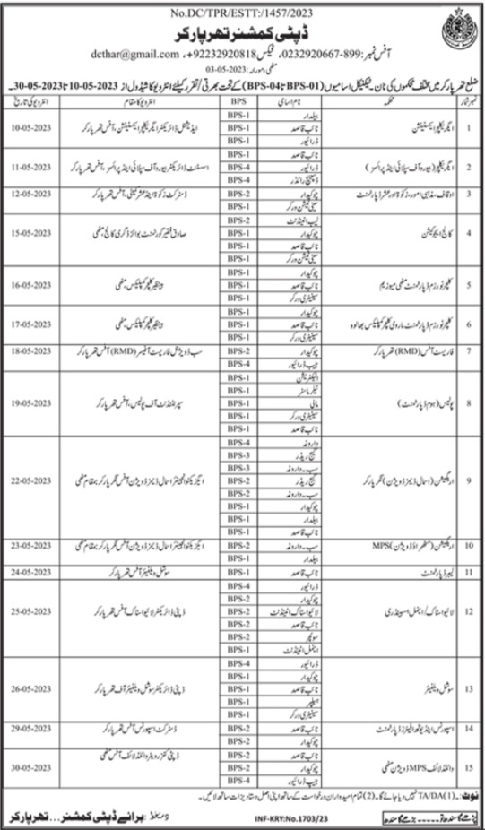 Deputy Commissioner Office jobs advertisement dated about 6 May 2023 in daily Jang Newspaper invites application for the vacant post of jeep driver, sanitation worker, lab attendant, darogha, sanitary worker, livestock attendant, naib qasid, animal attendant, malhi, sub darogha, dispatch rider, driver, gauge reader, tailor master, chowkidar and beldar in Tharparkar, tharparkar Sindh Pakistan. Preferred Education is Matric, Primary and Middle etc.
