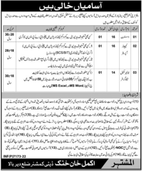 Deputy Commissioner District Office jobs advertisement dated about 28 December 2022 in daily Mashriq Newspaper invites application for the vacant post of assistant, computer o perator and stenographer in Upper Dir, upper dir Khyber Pakhtunkhwa KPK Pakistan. Candidates with BIT, Others, Bachelor, Intermediate, BCS and BA etc. educational background will be preferred.