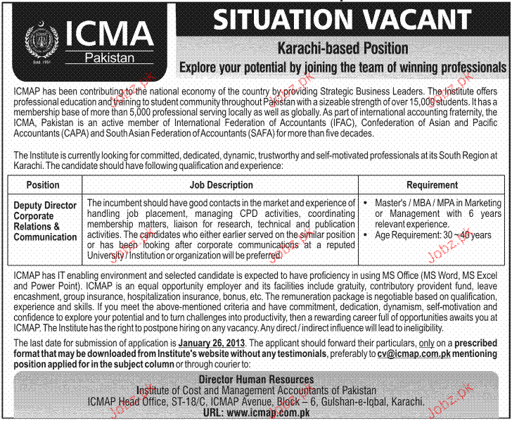 Apply as per details in job advertisement. Login to view further details of how to apply via https://www.jobz.pk online.