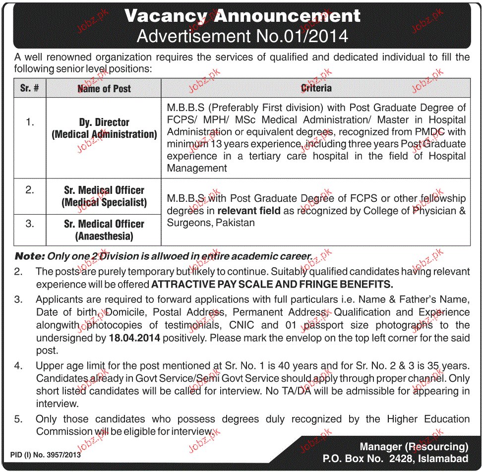 Apply as per details in job advertisement. Login to view further details of how to apply via https://www.jobz.pk online.