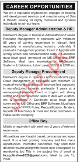 Deputy Manager Administration & HR Jobs 2020 In Karachi