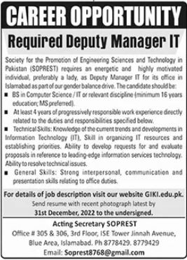 Society for the Promotion of Engineering Sciences & Technology SOPREST jobs advertisement dated about 15 December 2022 in daily Jang Newspaper invites application for the vacant post of deputy manager it in Islamabad, islamabad Islamabad Pakistan. Persons with Master and Bachelor etc. education can apply.