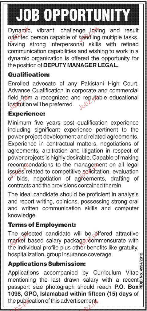 Apply as per details in job advertisement. Login to view further details of how to apply via https://www.jobz.pk online.