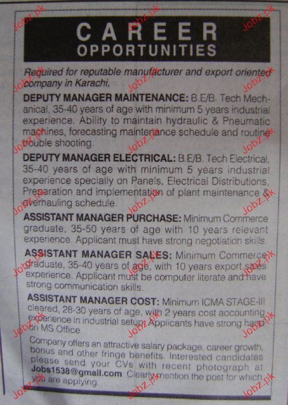 Deputy Manager Maintenance, Assistant Manager Wanted