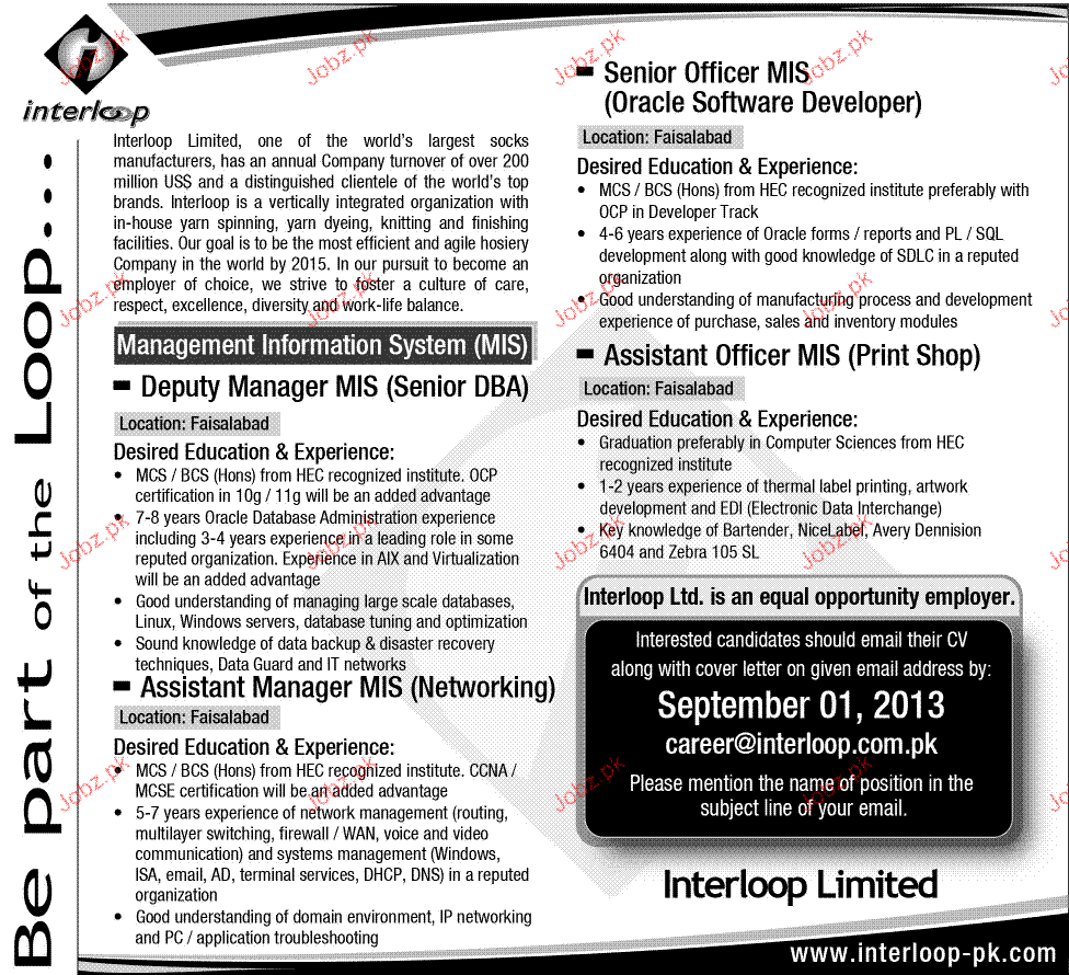 Deputy Manager MIS, Assistant Officer MIS Jobs in Interloop