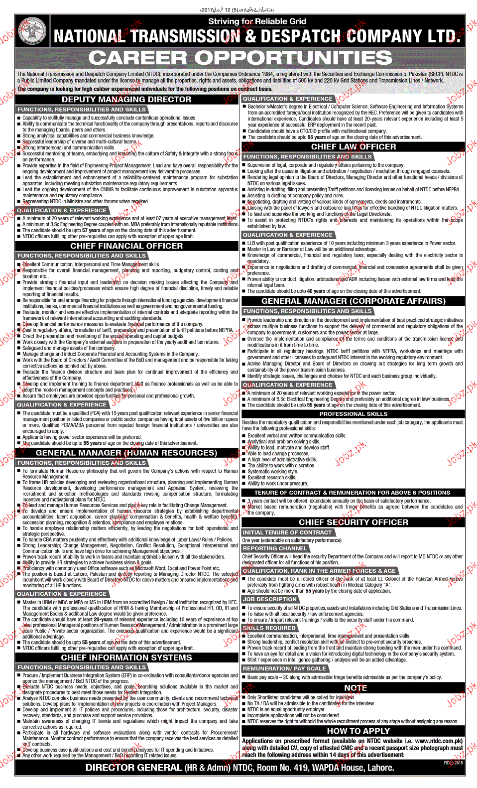 Apply as per details in job advertisement. Login to view further details of how to apply via https://www.jobz.pk online.