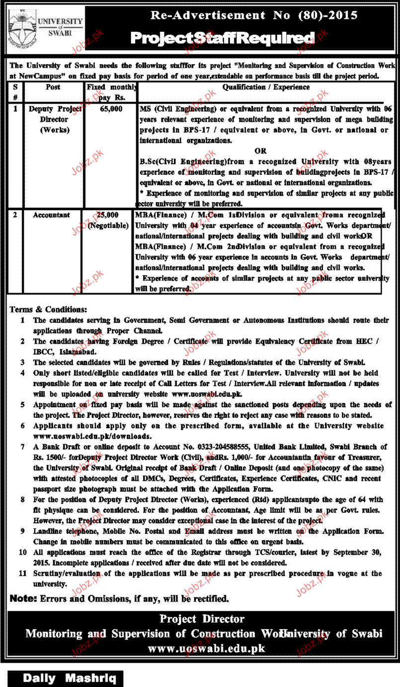 Apply as per details in job advertisement. Login to view further details of how to apply via https://www.jobz.pk online.