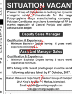 Deputy Sales Manager And Assistant Manager Sales Wanted