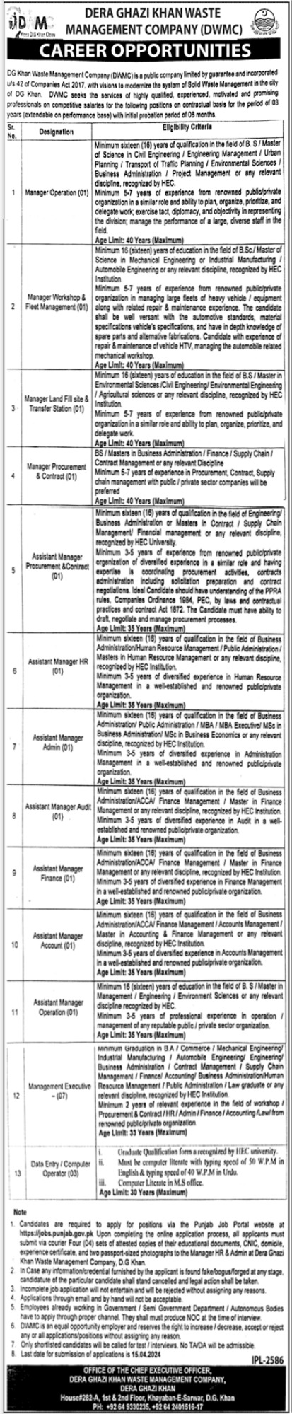 Latest Government jobs in Dera Ghazi Khan Waste Management Company in Management and others can be applied till 15 April 2024 or as per closing date in newspaper ad. Read complete ad online to know how to apply on latest Dera Ghazi Khan Waste Management Company job opportunities.