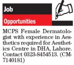 Aesthetic Clinic invites applications for job positions advertised in daily The News dated 23 November 2023 for following vacancies in Lahore, lahore Punjab Pakistan.