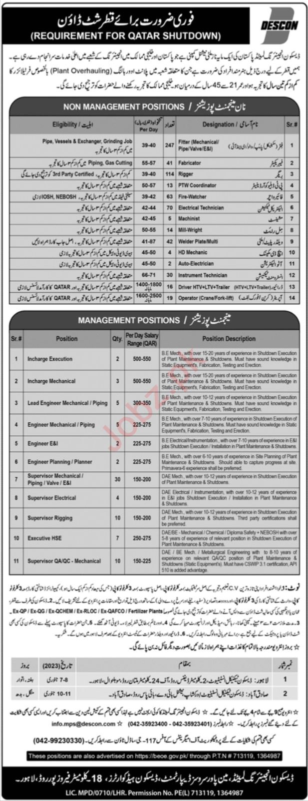 Descon Engineering Limited is looking for candidates for following posts as per job advertisement published in daily Jang Newspaper of January 1, 2023 for location Qatar, qatar Qatar: