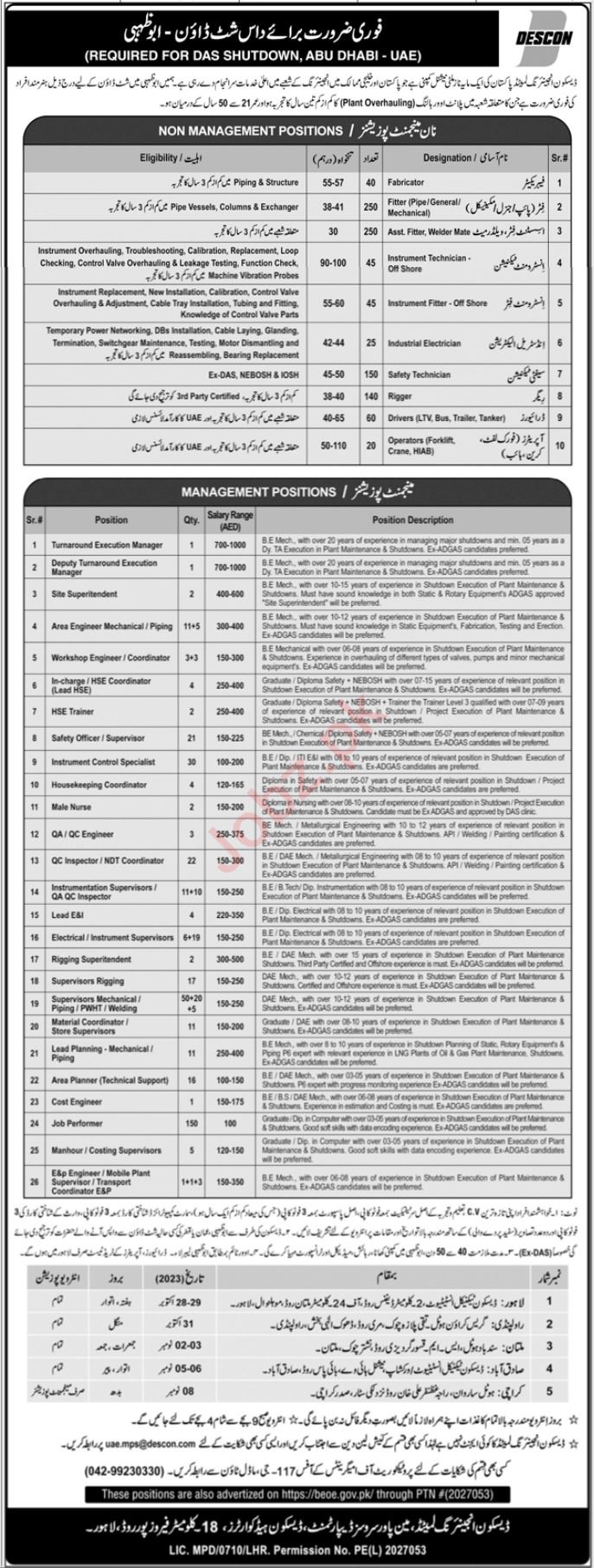 Descon Engineering Limited invites applications for job positions advertised in daily Jang dated 22 October 2023 for following vacancies in Abu Dhabi, abu dhabi UAE.