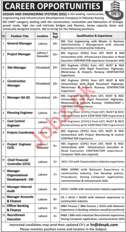 Design & Engineering Systems DES Private Limited Lahore, Pakistan is seeking candidates for the posts of General Manager, GM, Project Manager, Site Manager, Construction Manager, Manager QA, Manager QC, Planning Engineer, Engineer, Cost Control Engineer, Project Coordinator, Project Engineer, Civil Engineer, Chief Financial Controller, CFO, Manager Organizational Development, Manager Internal Audit, Manager Accounts, Manager Finance, Recruitment Executive.
