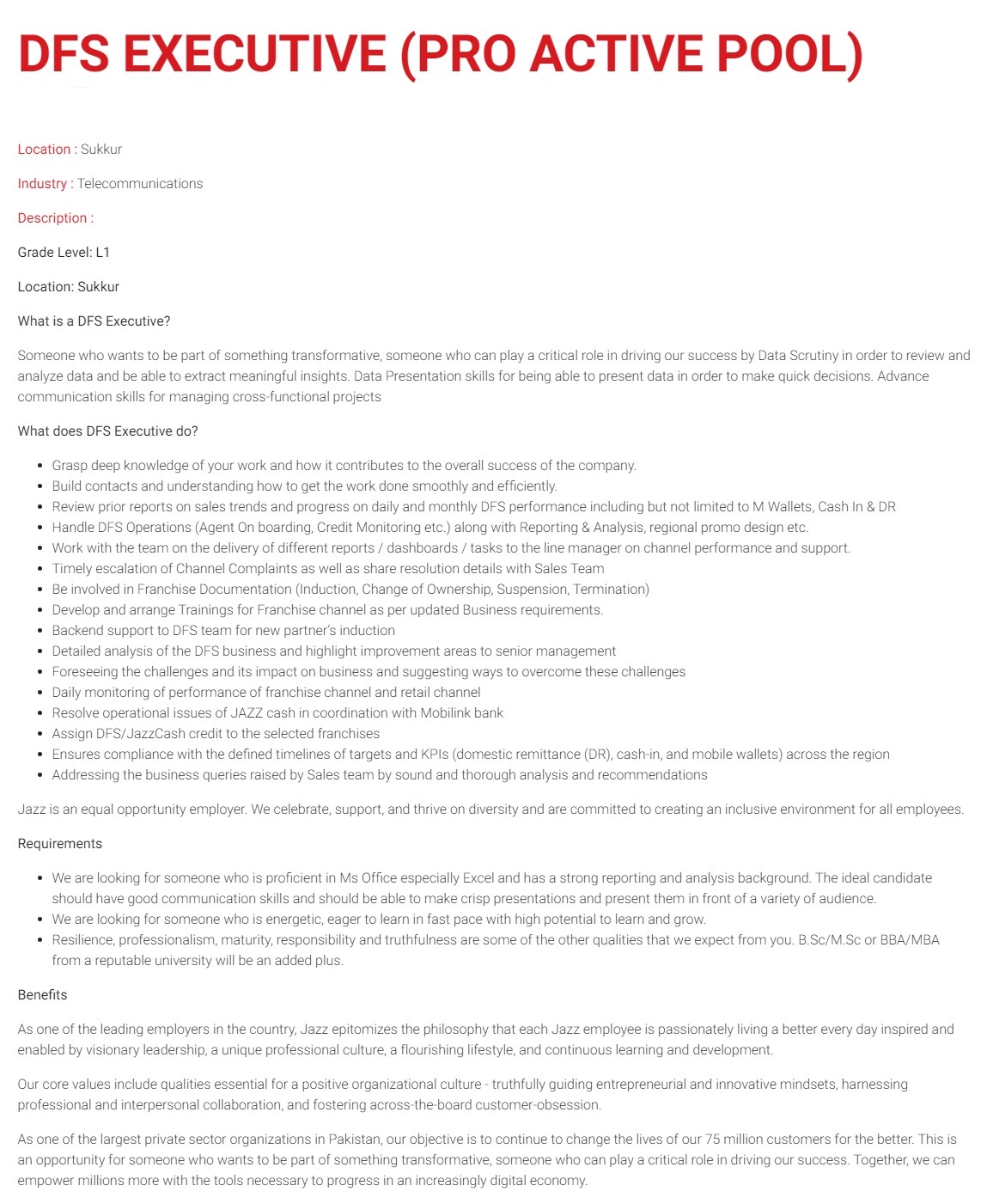 Vacant posts including dfs executive pro active pool are announced in Jazz Telecom Sukkur, sukkur Sindh Pakistan as per 11 January 2023 advertisement in daily Other Newspaper. Persons with Bachelor and Master etc. education can apply.