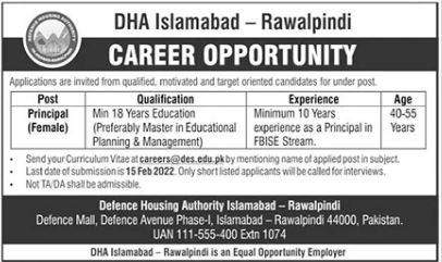 Defence Housing Authority DHA Islamabad Pakistan invites applications from eligible candidates for the post of principal as per advertisement of February 6, 2022 published in daily The News Newspaper. Master etc. educational qualification will be preferred.