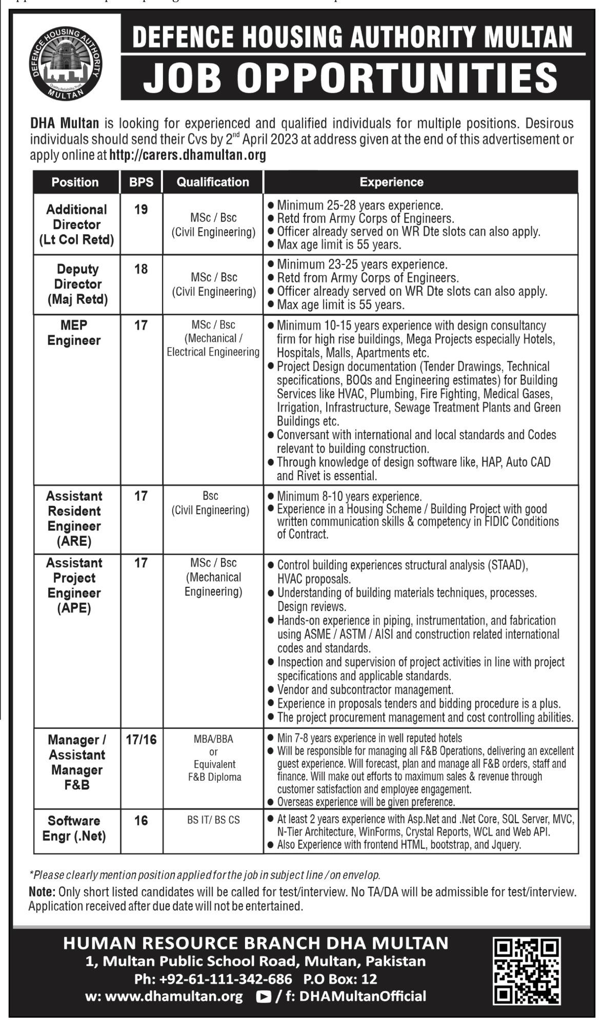 Defence Housing Authority DHA Multan, multan Punjab Pakistan invites applications from eligible candidates for the post of additional director, software engineer dot net, assistant resident engineer are, Manager F&B, Assistant Manager F&B, assistant project engineer ape, software engineer, mep engineer and deputy director as per advertisement of March 26, 2023 published in daily Nation Newspaper. Others, BBA, MBA, Master, M.sc and Bachelor etc. educational qualification will be preferred.