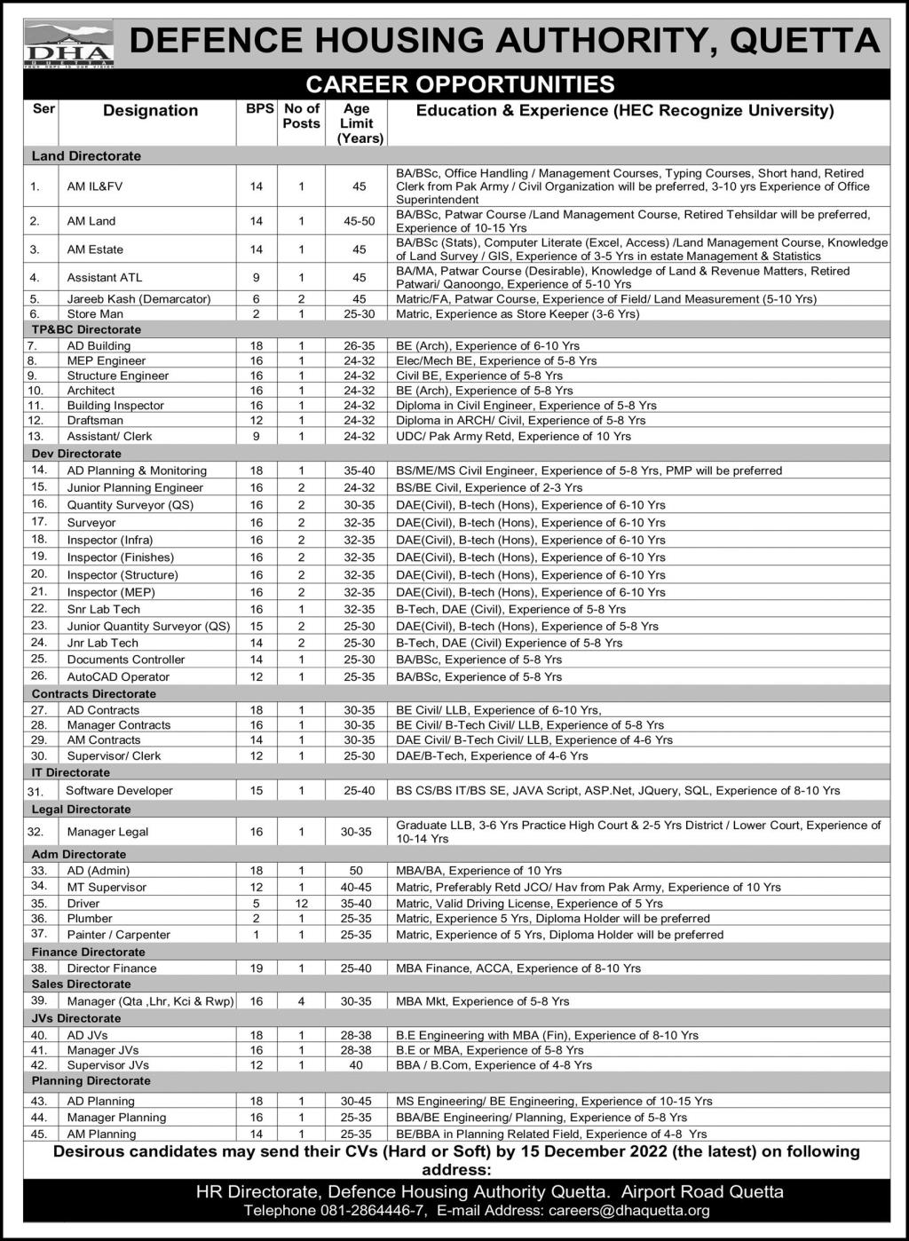 Defence Housing Authority DHA invites applications for job positions advertised in daily Express dated 4 December 2022 for following vacancies in Quetta, quetta Balochistan Pakistan.
