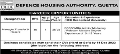 Defence Housing Authority DHA jobs advertisement dated about 10 December 2022 in daily Jang Newspaper invites application for the vacant post of manager record and manager transfer in Quetta, quetta Balochistan Pakistan. Candidates with Bachelor, MBA and Master etc. educational background will be preferred.