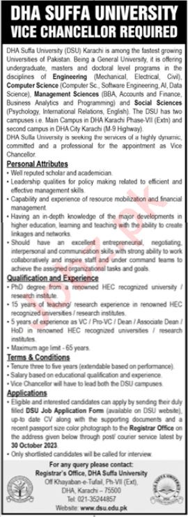 Vacancies in DHA Suffa University Advertisement October 2023