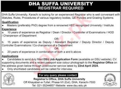 DHA Suffa University Karachi, karachi Sindh Pakistan invites applications from eligible candidates for the post of registrar as per advertisement of April 7, 2024 published in daily Jang Newspaper. Preferred Education is Phd etc.