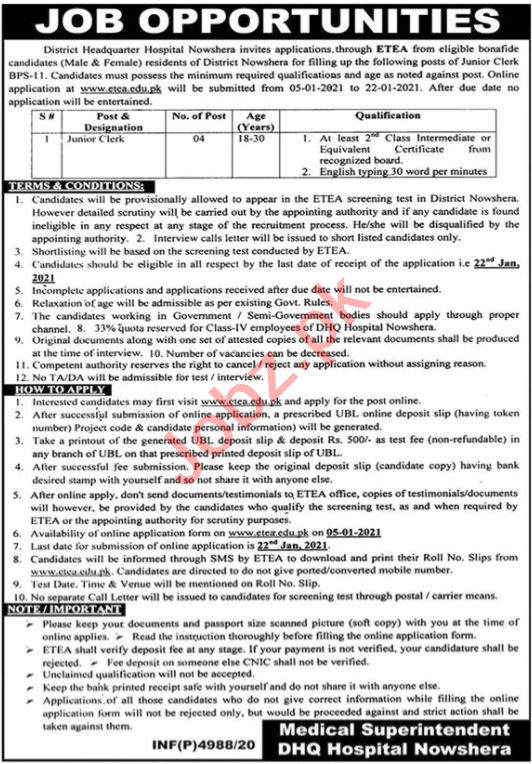 DHQ Hospital Nowshera Jobs 2021 For Junior Clerk