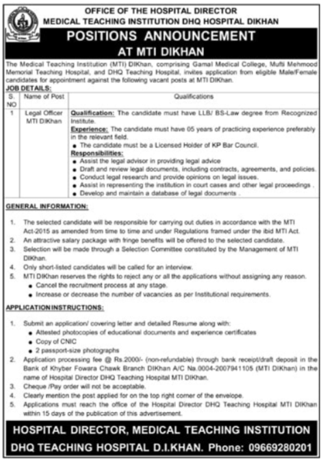 DHQ Teaching Hospital DI Khan Jobs 2025 For Legal Officer