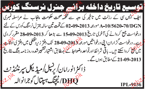 DHQ Teaching Hospital Gujranwala Admission in General Nursing in Gujranwala Read newspaper ad for exact details.
