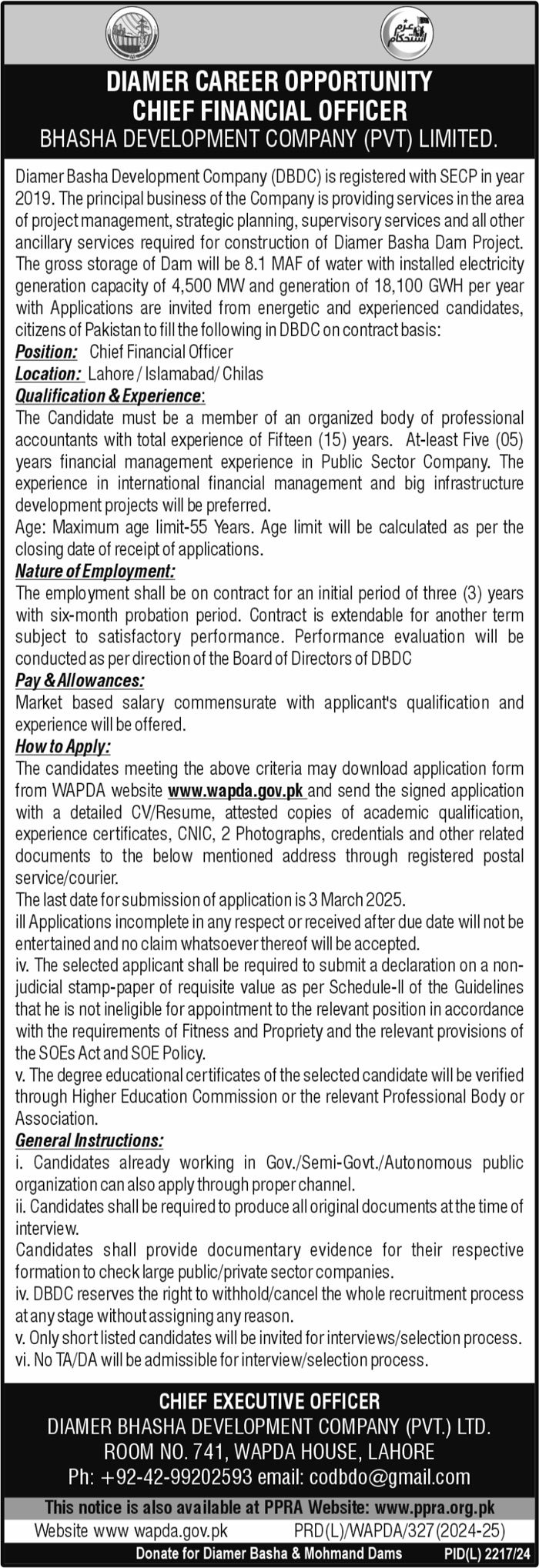 Diamer Basha Development Company DBDC, Water and Power Development Authority WAPDA Lahore, chilas and islamabad Punjab Pakistan invites applications from eligible candidates for the post of chief financial officer and cfo as per advertisement of February 7, 2025 published in daily Roznama 92 News Newspaper. Educational qualifications required CA, Others, Master and ACCA etc.