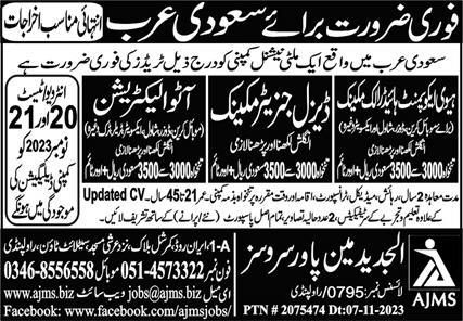 Al Jadid ManPower Services latest Private Automotive jobs and others can be applied till 21 November 2023 or as per closing date in newspaper ad. Read complete ad online to know how to apply on latest Al Jadid ManPower Services job opportunities. Electricians and Automotive Engineering skills may beneficial for these Al Jadid ManPower Services jobs. Salary varies from 275000. Extra hours work allowed to earn more. Employer provides medical, accommodation and transport facility.