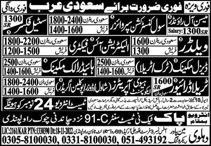 Pak Techni Test Center jobs advertisement dated about 23 November 2022 in daily Express Newspaper invites application for the vacant post of diesel mechanic, hydraulic mechanic, civil construction supervisor, heavy equipment operator, steel fixer, driver, traila driver and mason in Madina, riyadh Saudi Arabia. Persons with Bachelor, Middle, Intermediate and Matric etc. education can apply.