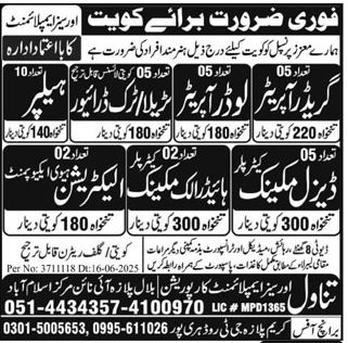 Tanawal Overseas Employment Corporation jobs advertisement dated about 17 June 2025 in daily Aaj Newspaper invites application for the vacant post of truck driver, grader operator, electrician, traila driver, loader operator, helper, diesel mechanic and hydraulic mechanic in Kuwait, kuwait Kuwait. Educational qualifications required DAE, Bachelor, Matric and Intermediate etc.