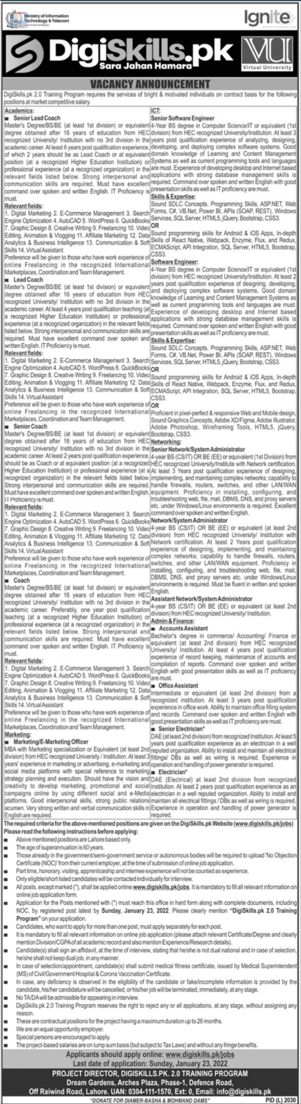 DigiSkills Training Project DSTP is looking for candidates for following posts as per job advertisement published in daily Jang Newspaper of January 9, 2022 for location Lahore Punjab Pakistan: