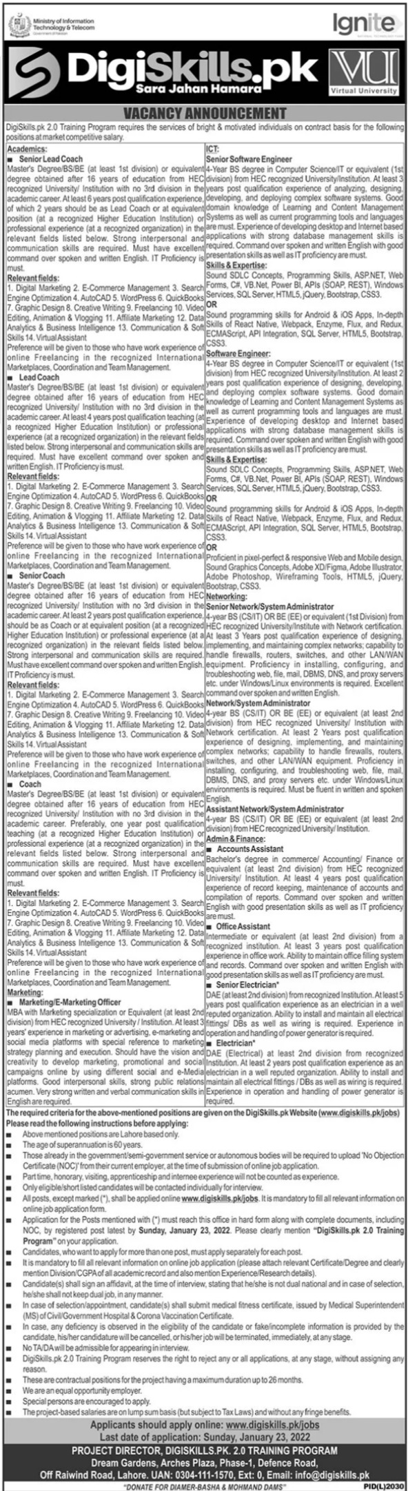 Vacant posts including Lead Coach, Marketing Officer, Assistant Network, Coach, Accounts Assistant, Software Engineer, Electrician, Network Administrator, Office Assistant, System Administrator and E Marketing Officer are announced in DigiSkills Training Project DSTP Lahore Punjab Pakistan as per 9 January 2022 advertisement in daily The News Newspaper. Preferred Education is MBA, DAE, Others, B.E, Bachelor and Master etc.