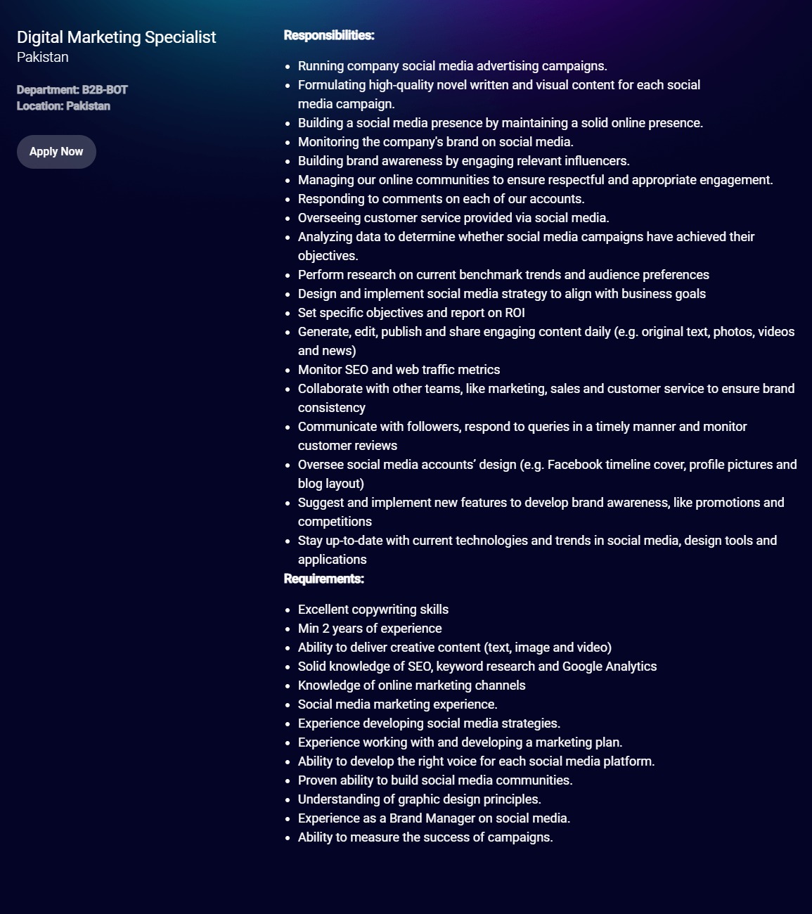 Apply as per details in job advertisement. Login to view further details of how to apply via https://www.jobz.pk online.