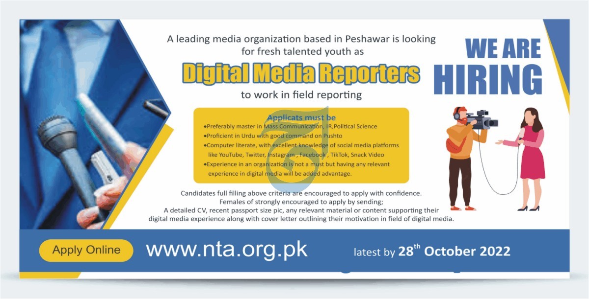 Media Organization is looking for candidates for following posts as per job advertisement published in daily Aaj Newspaper of October 20, 2022 for location Peshawar, peshawar Khyber Pakhtunkhwa KPK Pakistan: