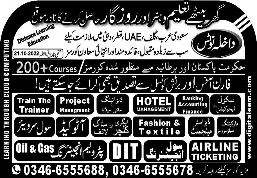 Digitaleem admissions 2022 for School Education, Banking Accounting & Finance, Hotel Management, Multimedia Designing, Project Manager, Train the Trainer, Marketing Sales Services, Disaster Management, Fashion & Textile, Agriculture & Livestock, Auto CAD, Civil Surveyor, Airline Ticketing, Civil Engineer, DIT, Petroleum Engineering Oil & Gas. has been announced. Digitaleem Islamabad Islamabad Pakistan welcomes students to apply for admissions in academic year 2022 in Technical Course. Students who want to enroll for academic session 2022 in Diploma and Course qualification and admission criteria for Private institute can apply till last date 16 November 2022. Read newspaper ad for exact details.