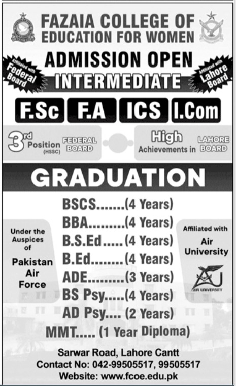 Fazaia College of Education For Women admissions 2022 for MMT, Advanced Diploma, ADE, BS , BBA, BSCS, B.Ed has been announced. Fazaia College of Education For Women Lahore Punjab Pakistan welcomes students to apply for admissions in academic year 2022 in Management College. Students who want to enroll for academic session 2022 in ADP, Bachelor, BBA, B.ed and BS qualification and admission criteria for Government institute can apply till last date 6 June 2022. Read newspaper ad for exact details.