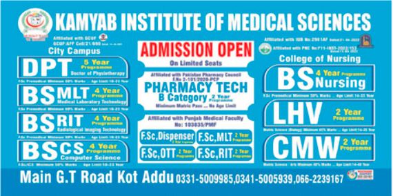 Admissions in Kamyab Institute of Medical Sciences 2023 for Diploma Program, Bachelor Programs, DPT Programs has been announced. Eligible students can apply for academic admissions 2023 in Kamyab Institute of Medical Sciences Kot Adu Punjab Pakistan for Medical University. Eligible students for fulfilling criteria for admissions in Diploma, DPT, BSN, BCS and Bachelor can enroll as per Private admission policy 2023 till closing date 8 November 2023. Read newspaper ad for exact details.