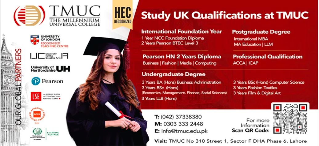 The Millennium Universal College TMUC admissions 2024 for Diploma, BS Programs has been announced. Eligible students who qualify as per admission criteria in The Millennium Universal College TMUC Lahore Punjab Pakistan can apply in Science University for academic year 2024. Eligible candidates for admissions in Diploma and BS can apply as per Private institute criteria and before closing date 22 July 2024 after reading advertisement online. Read newspaper ad for exact details.