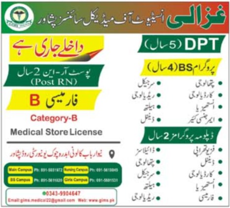 Ghazali Institute of Medical Sciences has announced admissions 2023 for Diploma in Physiotherapy, Diploma in Dental, Diploma in Cardiology, Diploma in Anesthesia, Diploma in Pharmacy, Diploma in Dialysis, Diploma in Pathology, BS Pathology, BS Surgical, BS Cardiology, BS Radiology, BS Anesthesia, BS Health, BS Emergency Care, BS Dental. Students who want to take admissions in Ghazali Institute of Medical Sciences Peshawar Khyber Pakhtunkhwa KPK Pakistan for academic year 2023 to continue education in Medical University can apply. Students for admissions in Diploma and BS can apply for online or campus classes as per Private institute criteria till admission closing date February 22, 2023. Read newspaper ad for exact details.