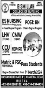 Admissions in Bismillah College of Nursing 2024 for Diploma, BSN, Post RN has been announced. Eligible students who qualify as per admission criteria in Bismillah College of Nursing Multan Punjab Pakistan can apply in Medical College for academic year 2024. Students for admissions in BSN, Bachelor and Diploma can apply for online or campus classes as per Private institute criteria till admission closing date December 23, 2024. Read newspaper ad for exact details.