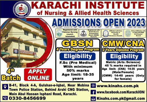 Karachi Institute of Nursing & Allied Health Sciences Bachelor of Nursing BSN, Community Midwifery CMW, Certified Nursing Assistant CNA admissions 2023 has been started. Eligible students who qualify as per admission criteria in Karachi Institute of Nursing & Allied Health Sciences Karachi Sindh Pakistan can apply in Medical College for academic year 2023. Students for admissions in Diploma and BSN can apply for online or campus classes as per Private institute criteria till admission closing date September 13, 2023. Read newspaper ad for exact details.