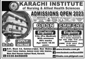 Karachi Institute of Nursing & Allied Health Sciences Community Midwifery CMW, Certified Nursing Assistant CNA, GBSN admissions 2023 has been announced. Karachi Institute of Nursing & Allied Health Sciences Karachi Sindh Pakistan welcomes students to apply for admissions in academic year 2023 in Science College. Eligible students for fulfilling criteria for admissions in BSN and Diploma can enroll as per Private admission policy 2023 till closing date 3 October 2023. Read newspaper ad for exact details.