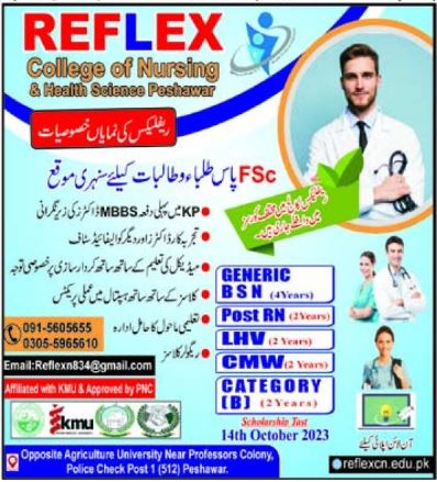 Reflex College of Nursing admissions 2023 for Lady Health Visitor, Community Midwife CMW, BSN has been announced. Eligible students can apply for academic admissions 2023 in Reflex College of Nursing Peshawar Khyber Pakhtunkhwa KPK Pakistan for Medical College. Students for admissions in Diploma, BSN and B Pharmacy can apply for online or campus classes as per Private institute criteria till admission closing date December 5, 2023. Read newspaper ad for exact details.