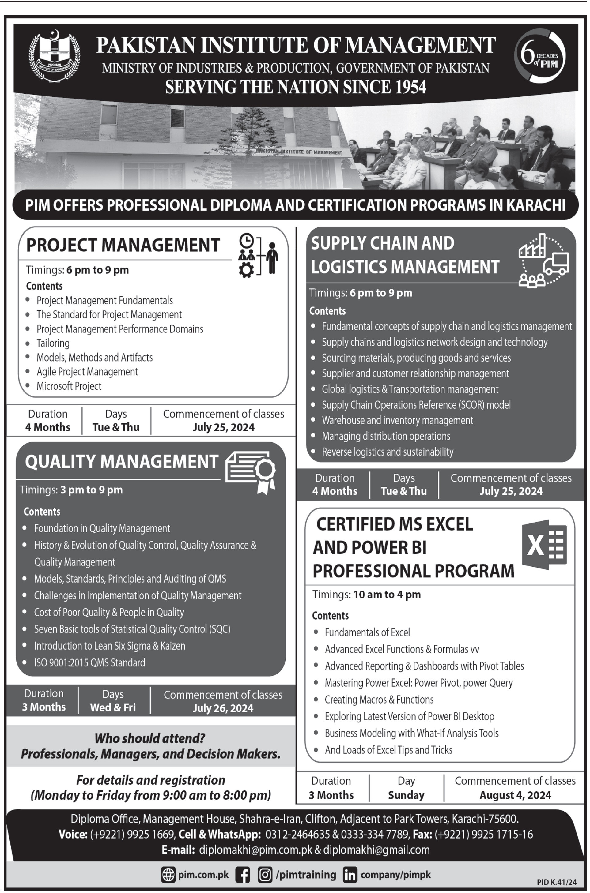 Admissions in Pakistan Institute of Management 2024 for Project Management, Quality Management, Supply Chain and Logistics Management, Certified MS Excel and Power BI Professional Program has been announced. Students who want to take admissions in Pakistan Institute of Management Karachi Sindh Pakistan for academic year 2024 to continue education in Management College can apply. Eligible students for fulfilling criteria for admissions in Course and Diploma can enroll as per Government admission policy 2024 till closing date 22 July 2024. Read newspaper ad for exact details.