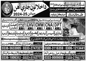 Blessing Institute of Nursing and Paramedics admissions 2024 for Diploma, DPT has been announced. Blessing Institute of Nursing and Paramedics Karachi Sukkur, Mirpur Khas, and Hyderabad Sindh Pakistan welcomes students to apply for admissions in academic year 2024 in Medical University. Students for admissions in DPT and Diploma can apply for online or campus classes as per Private institute criteria till admission closing date December 9, 2024. Read newspaper ad for exact details.