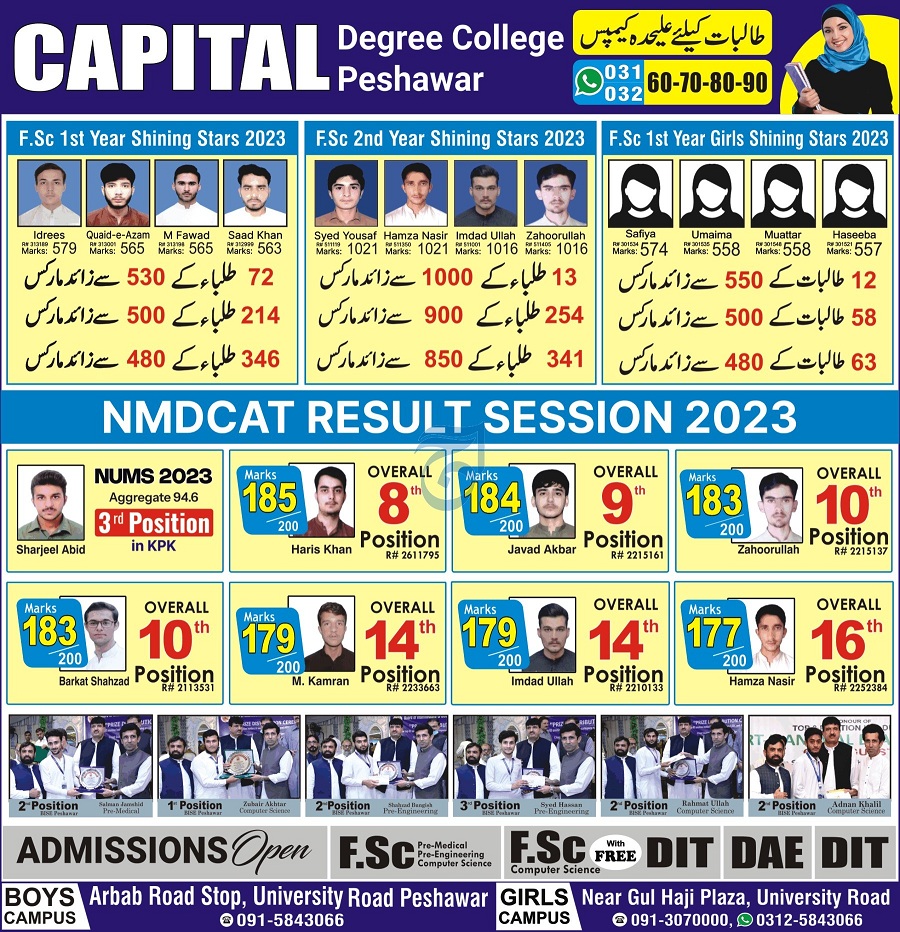 Capital Degree College has announced admissions 2024 for FSc, DIT, DAE. Eligible students who qualify as per admission criteria in Capital Degree College Peshawar Khyber Pakhtunkhwa KPK Pakistan can apply in Science College for academic year 2024. Students for admissions in DAE, DIT and Intermediate can apply for online or campus classes as per Private institute criteria till admission closing date September 9, 2024. Read newspaper ad for exact details.
