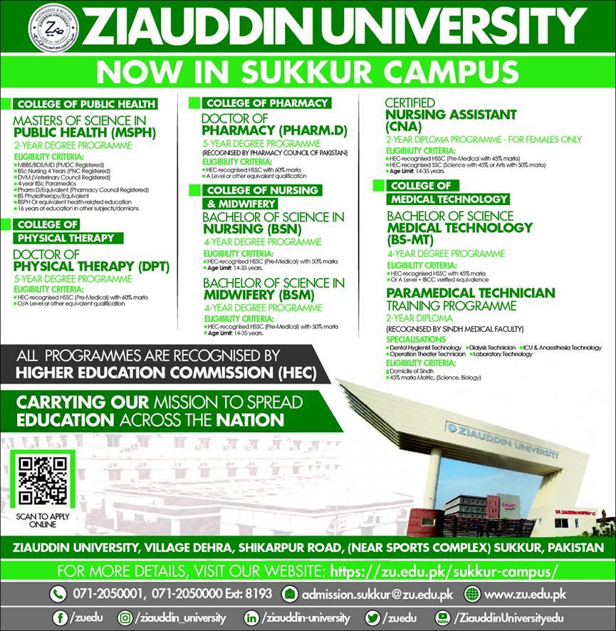Ziauddin University admissions 2024 for Diploma, BSN, DPT, MS has been announced. Ziauddin University Sukkur Sindh Pakistan welcomes students to apply for admissions in academic year 2024 in Science University. Students for admissions in Diploma, DPT, BSN and MS can apply for online or campus classes as per Private institute criteria till admission closing date November 11, 2024. Read newspaper ad for exact details.